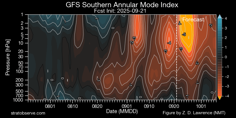 …and as a result the SAM (indication of how strong the Antarctic vortex is) is heading well into the negative over the coming days: