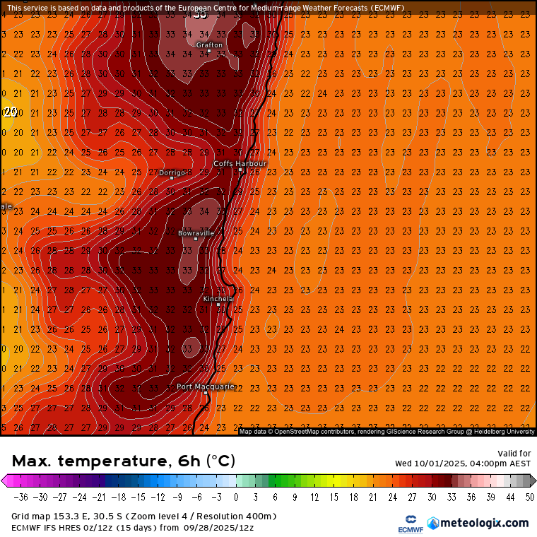 …but worth enjoying the cooler weather as by the time we hit midweek we’ll have another change moving in and that change will draw more hot air across from inland – so it’ll be hotter once again – here’s the forecast max temps for Wednesday: