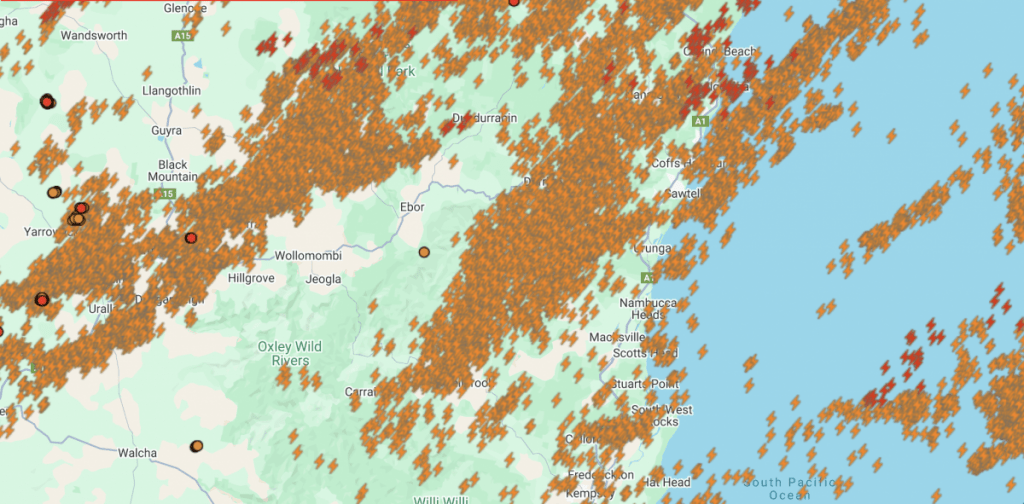 Well the promised storms certainly rolled through. Bigger storms late on Friday and then more in the west of the valleys through yesterday. Some decent rain totals as well – Thora saw over 40mm from Friday’s activities….though as is the nature of storms many saw considerably less. We had some good lightning as well – here’s the map showing lightning strikes from both days: