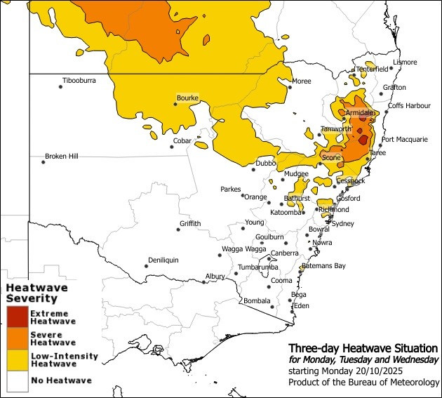 The BoM are in fact forecasting extreme heatwave conditions across the west of our region on Monday through Wednesday so worth being aware that temperatures could exceed what would normally be expected for this time of year in those locations. For those closer to the coast you’ll avoid the worst of the heat and could even be left wondering what all the chatter is about: