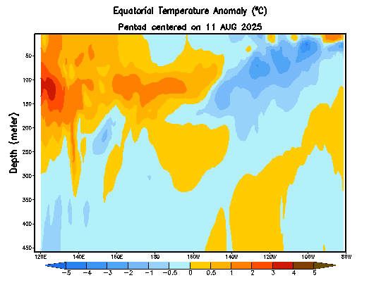 The Pacific is still looking La Nina-ish over coming months – however this cross section animation through the Pacific shows warm water starting to build across the west, and (with the right conditions) we could see that heat move across the Pacific and bring more El Nino-ish conditions through next winter and spring – something to keep an eye on: