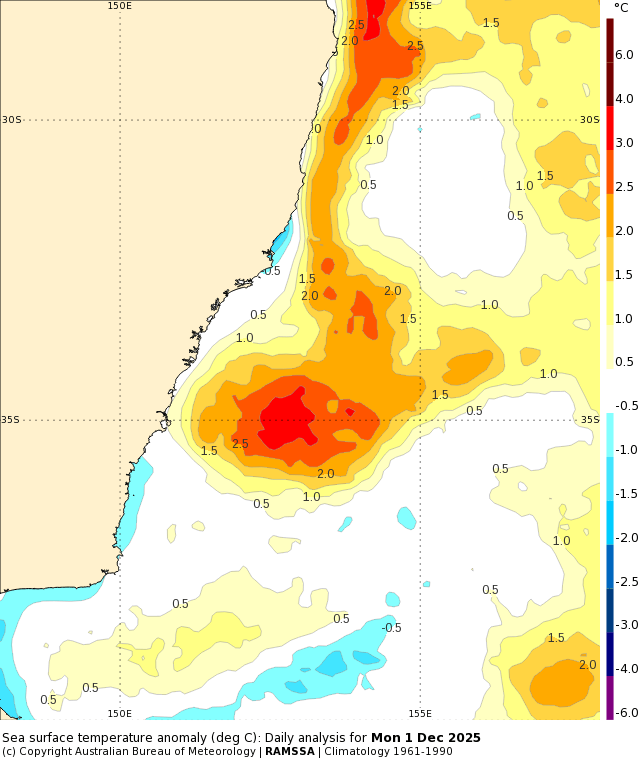Going forward and we should find the impact of the southern circulation diminish over time – just as the BoM declare a La Nina is in progress. A La Nina increases the risk of wetter weather as we move into / through summer…and that risk will also be magnified by significantly warmer than average waters offshore. Here’s how much warmer than average the ocean temperatures are sitting off the Qld and NSW coasts right now: