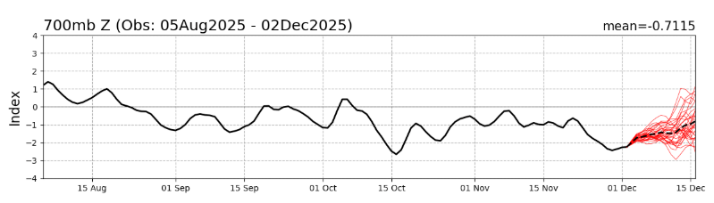 After a stormy period recent days have seen drier (and much cooler) weather move in. This is mainly due to a stronger negative period for the southern circulation. A negative (weaker) circulation means the winds tend to spread further out from the Antarctic, affecting areas further north and allowing colder air to likewise escape and move further north. We can see the current and forecast state of the circulation on the graph below: