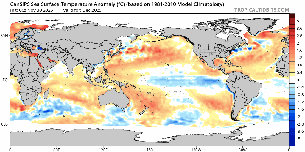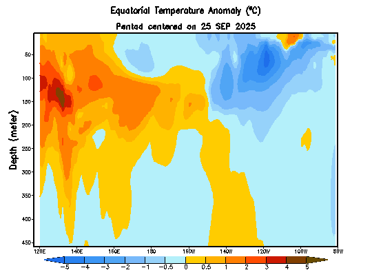 Looking ahead and we still have cool anomalies across the eastern Pacific – but the undersurface heat in the west Pacific is starting to build: