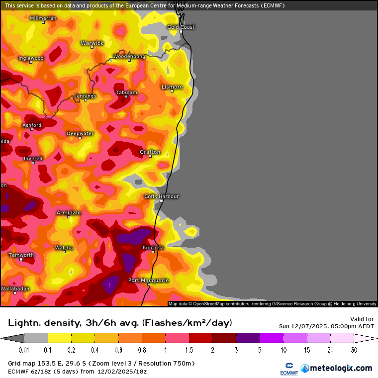 Much shorter term…we’ve got dry and increasingly warm weather as we head into the weekend…before a thundery breakdown occurs on Sunday. Chance of some decent storms with the change – here’s the current lightning forecast for Sunday arvo: