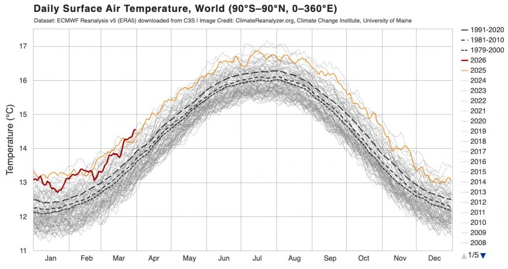 Looking at the global picture and – even before the El Nino has kicked in – the global average ocean temperature is sitting close to record highs – the red line shows 2026 values: