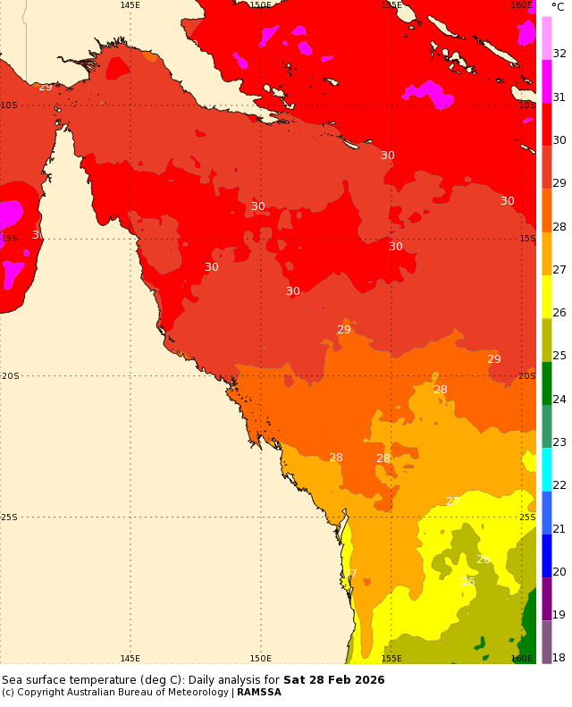 Combine the season with warmer than average ocean temperatures and sure enough the Coral Sea is hot enough to support cyclones. Current temps looking like this: