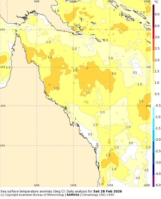We’ve got some very toasty waters just offshore from the NE NSW coast – tropical water getting pushed south: …from a warmer than average Coral