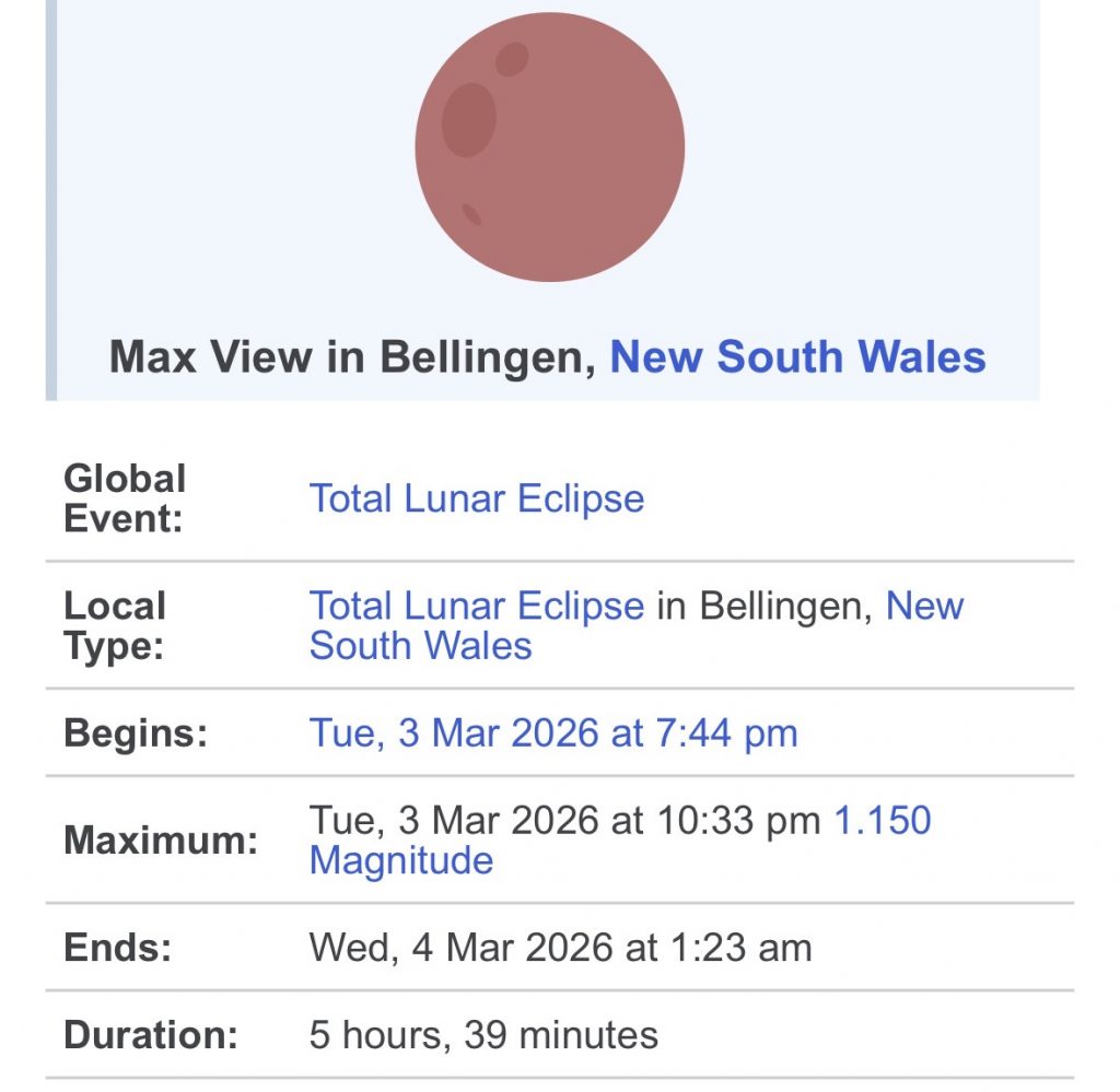 In the meantime…tomorrow night we have a total lunar eclipse happening. Skies looking fairly clear for at least some of the event, which is great news – timing for Bello and surrounds here: