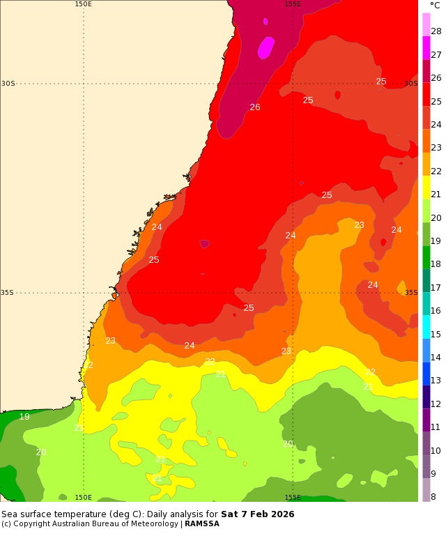 Looking at our region and we luckily missed out on the worst of the heat. We’ve also been fairly dry for this time of year – but it looks like we could see some wetter weather over the next couple of weeks. Ocean temperatures are around 26 to 27c just offshore: