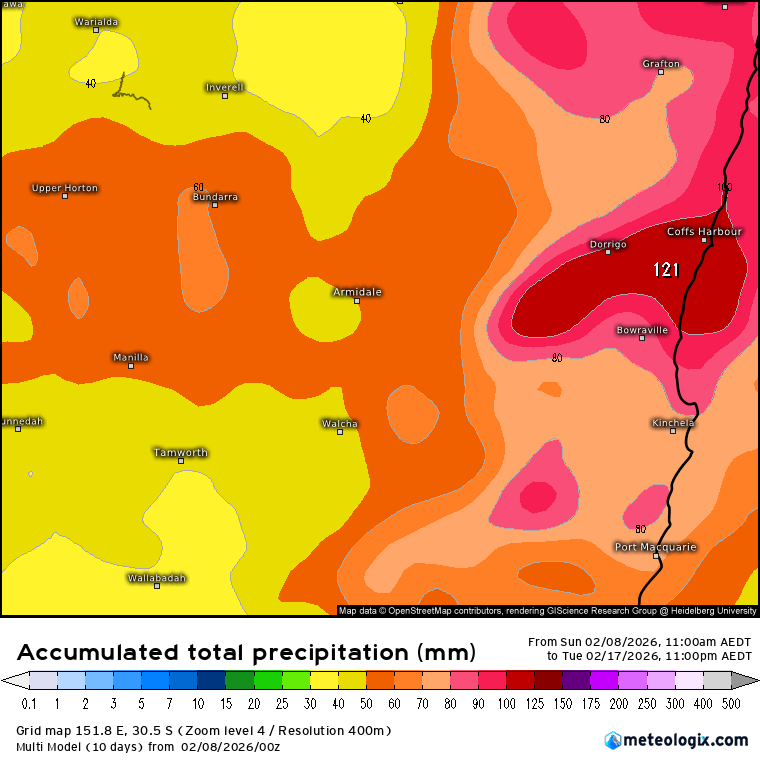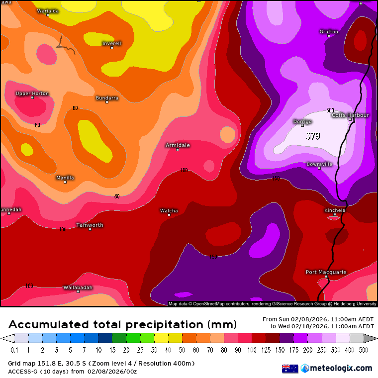 …while some of the more traditional models show much higher totals over the same period. Here’s the (likely well over the top) Australian ACCESS model 10 day forecast: