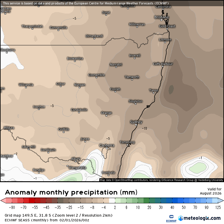 Before we get there though we still have the autumn predictability barrier to pass through – a small change at this time of year can have big impacts as we head through winter. Regardless models are putting their money on an El Nino as we hit spring. That has the potential to dry things out for us – as an example here’s the forecast rainfall anomaly for this month: