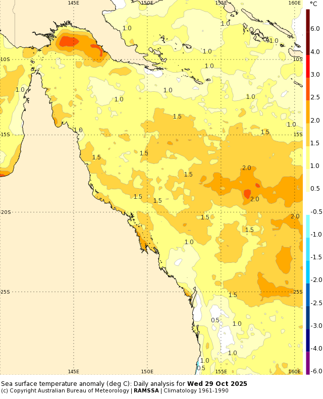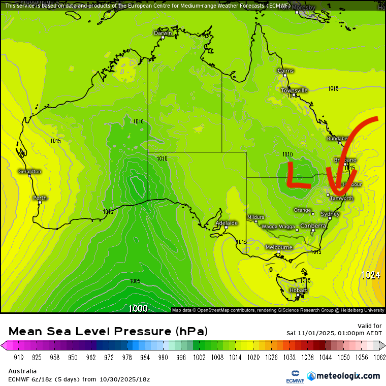 So a big day to come. The reason – an inland low will help destabilise the atmosphere and drag in moisture-laden air from a warmer than average Coral Sea: