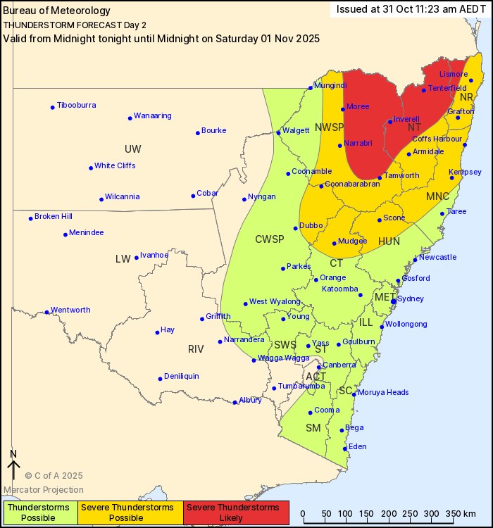 Thunderstorms are possible tomorrow (Saturday 1 November) for much of central inland NSW and for the entire NSW coast due to a trough. Severe thunderstorms are possible in the northeast, the Central West Slopes and Plains and for the upper Hunter and may extend as far south as the Blue Mountains. Additionally, severe thunderstorms are likely for the northern ranges, slopes and plains in an area east of Moree and north of Tamworth. These severe thunderstorms may bring the risk of damaging winds gusts (>90km/h), large hail (>2cm) and localised heavy rainfall.
