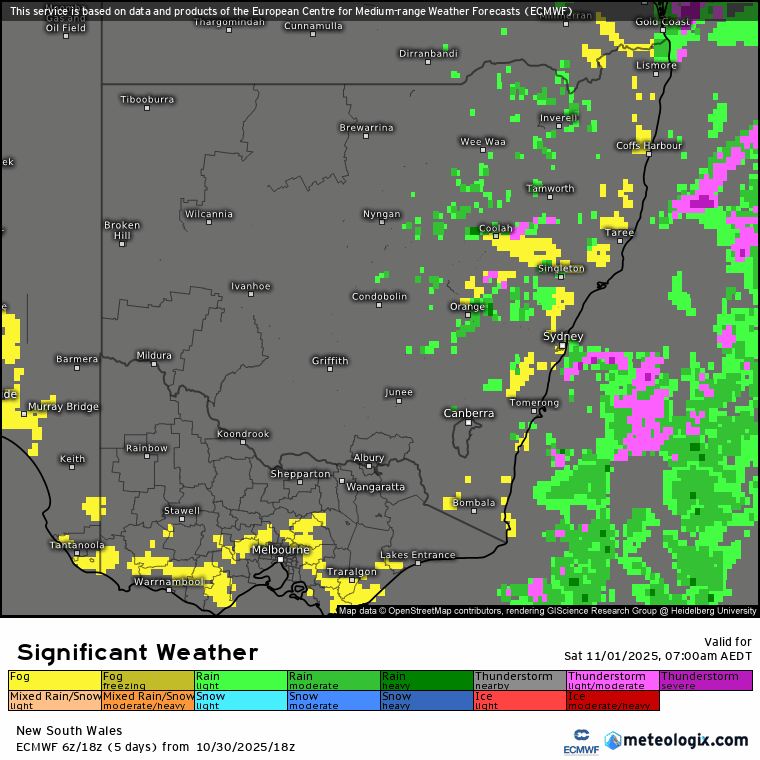 ….and if we add in the lightning forecast for tomorrow we can see storms for many, with significant storms likely around Inverell / other inland areas of NE NSW: