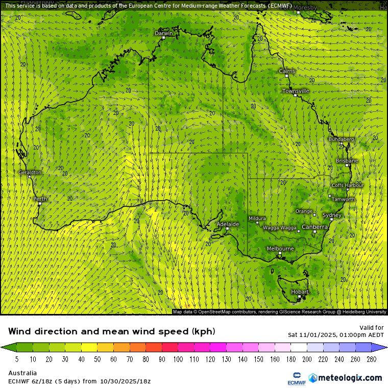 And you can see this clearly in the 1pm wind forecast with surface winds moving across the above-average Coral Sea before landing on the east coast: